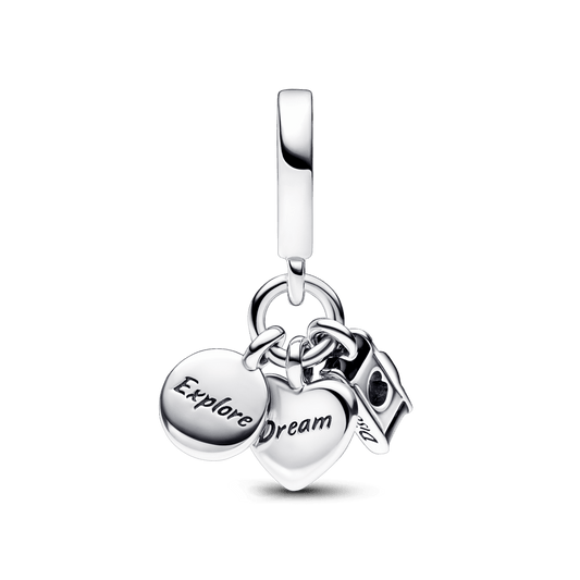 Charm Colgante Triple Cámara, Corazón y Brújula